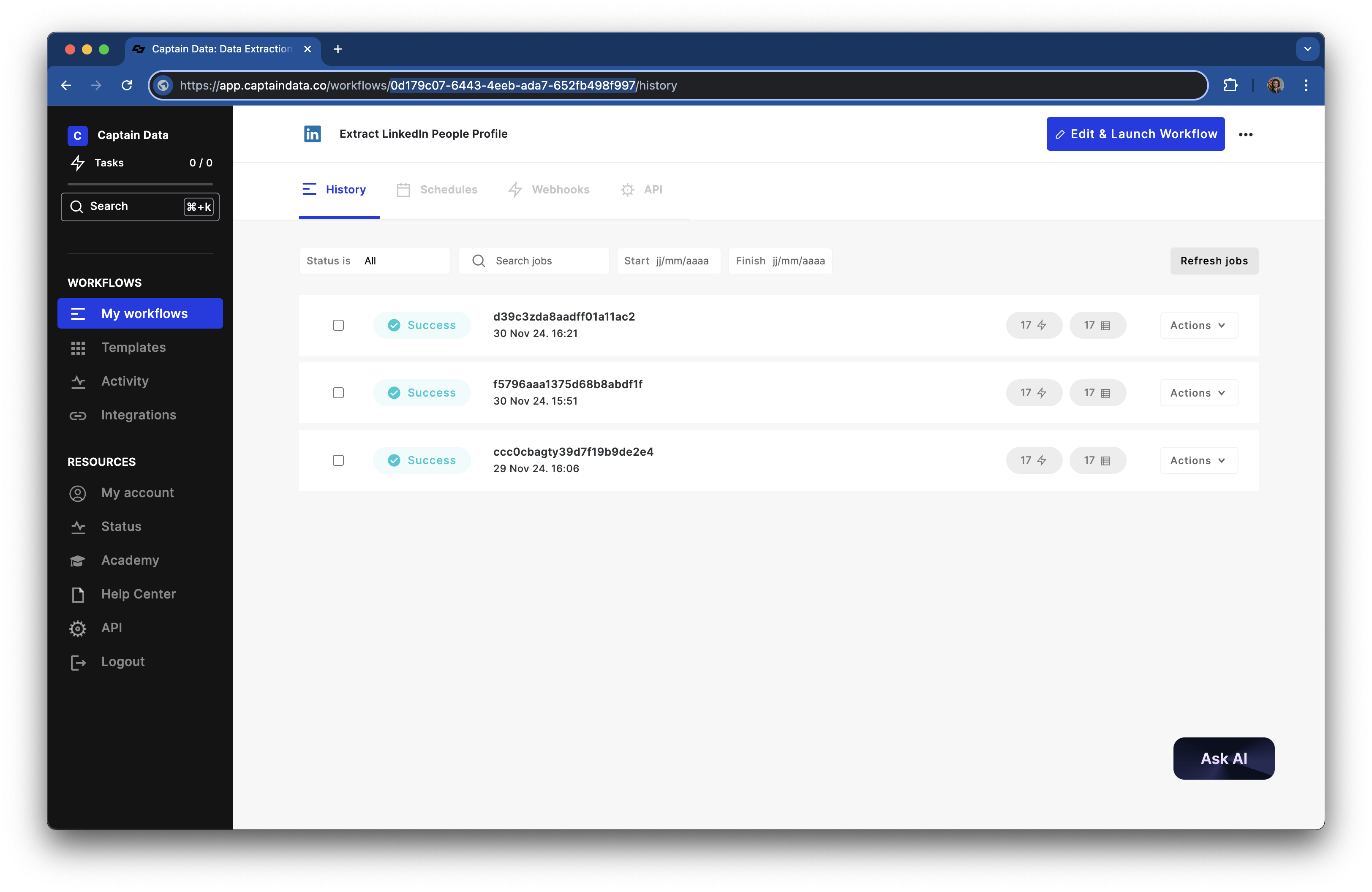 - On the Captain Data platform, identify the workflow(s) you want to launch (e.g. Extract LinkedIn People Profile)