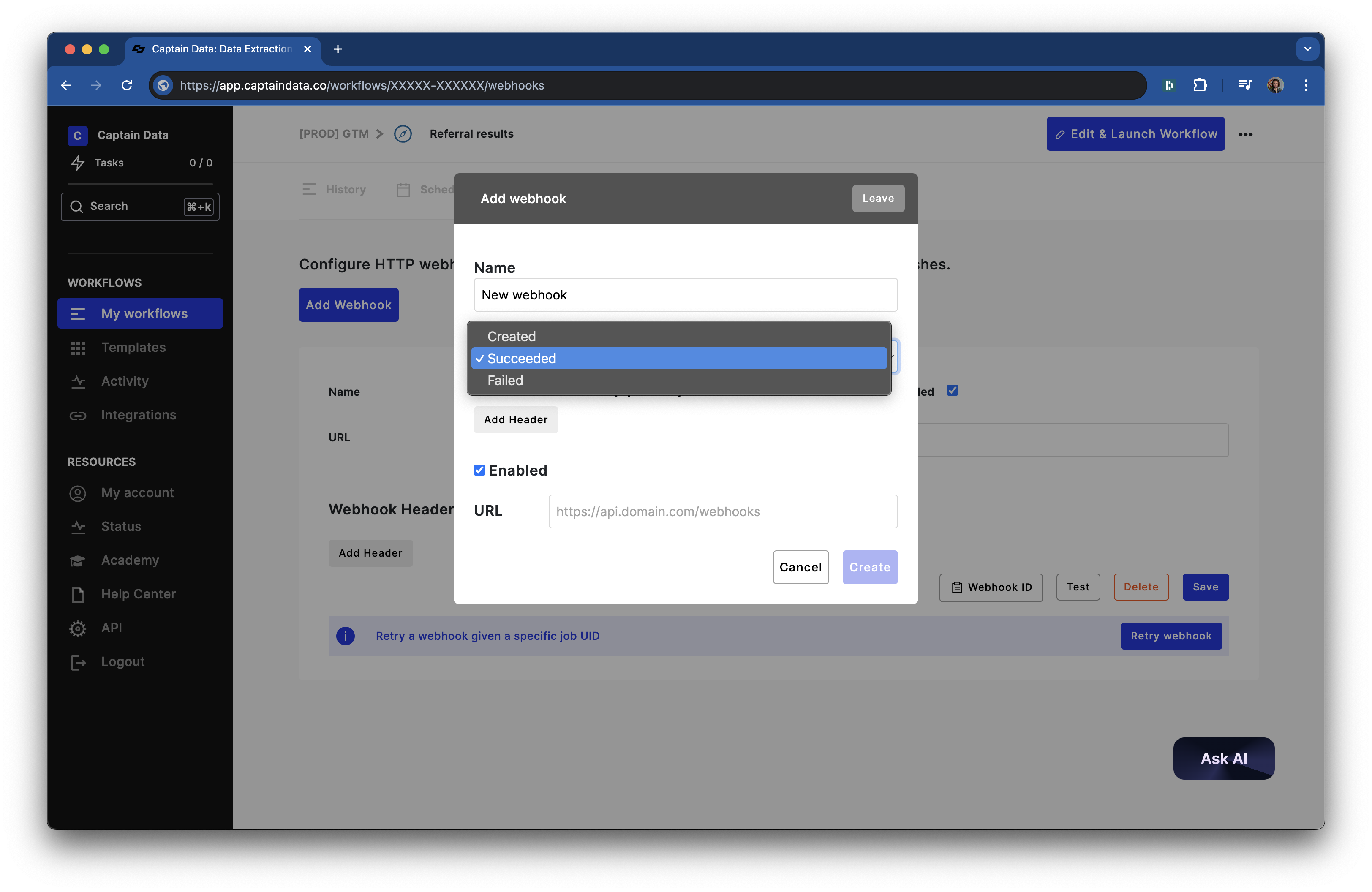 Currently, webhooks cannot be added via the API. To add one manually through the Captain Data app:- Open one of your Runs and navigate to the Webhooks tab.