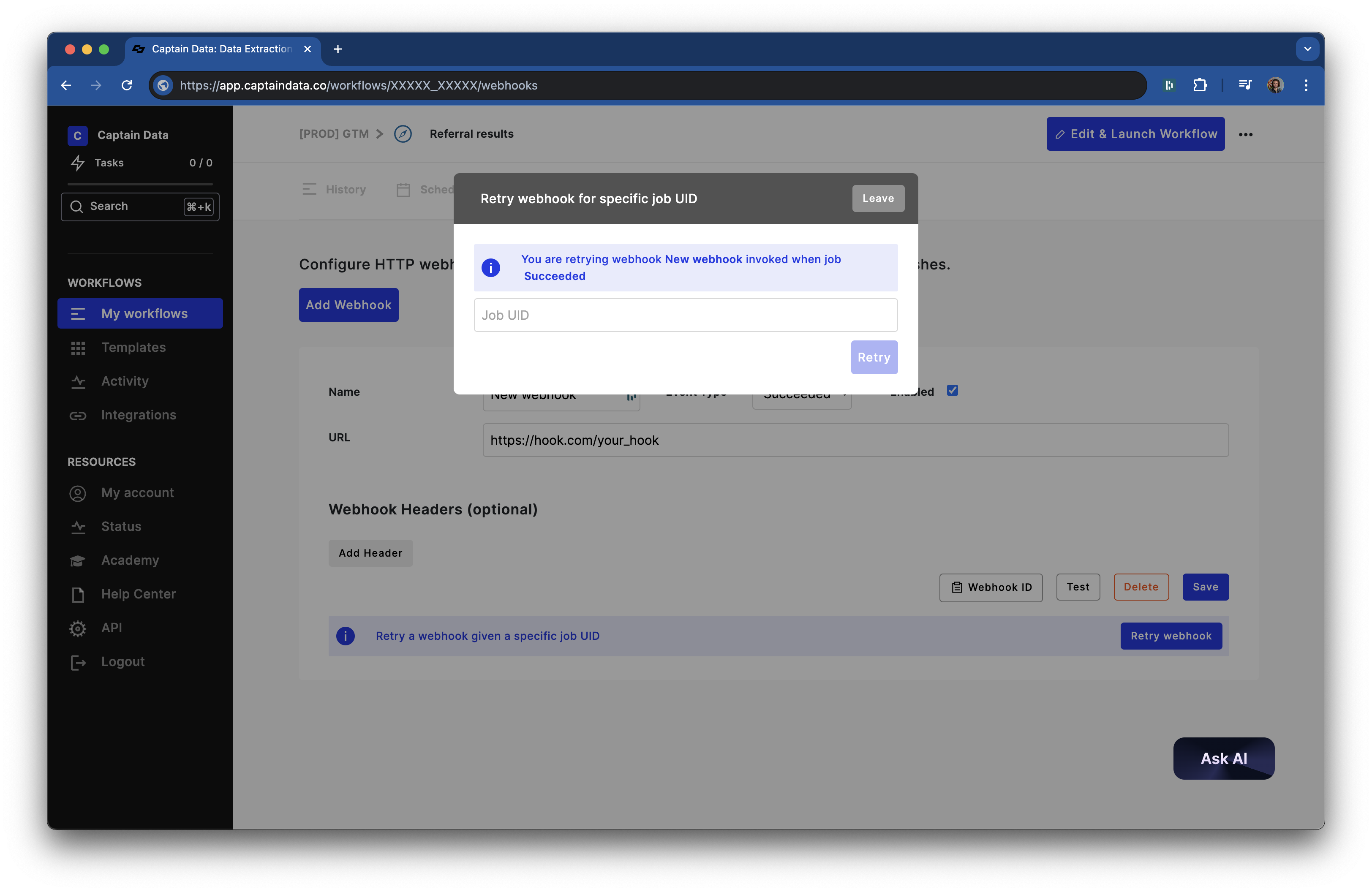To retry a webhook, use the Retry Webhook endpoint:{job_uid} with the relevant job UID. For detailed instructions, refer to the Retry Webhook Documentation.